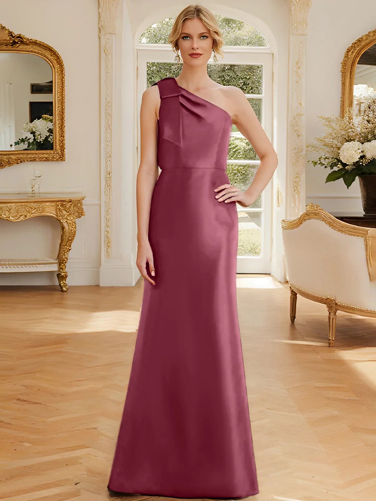 Tight fit/straight leg one shoulder sleeveless satin bow mother of the bride dress